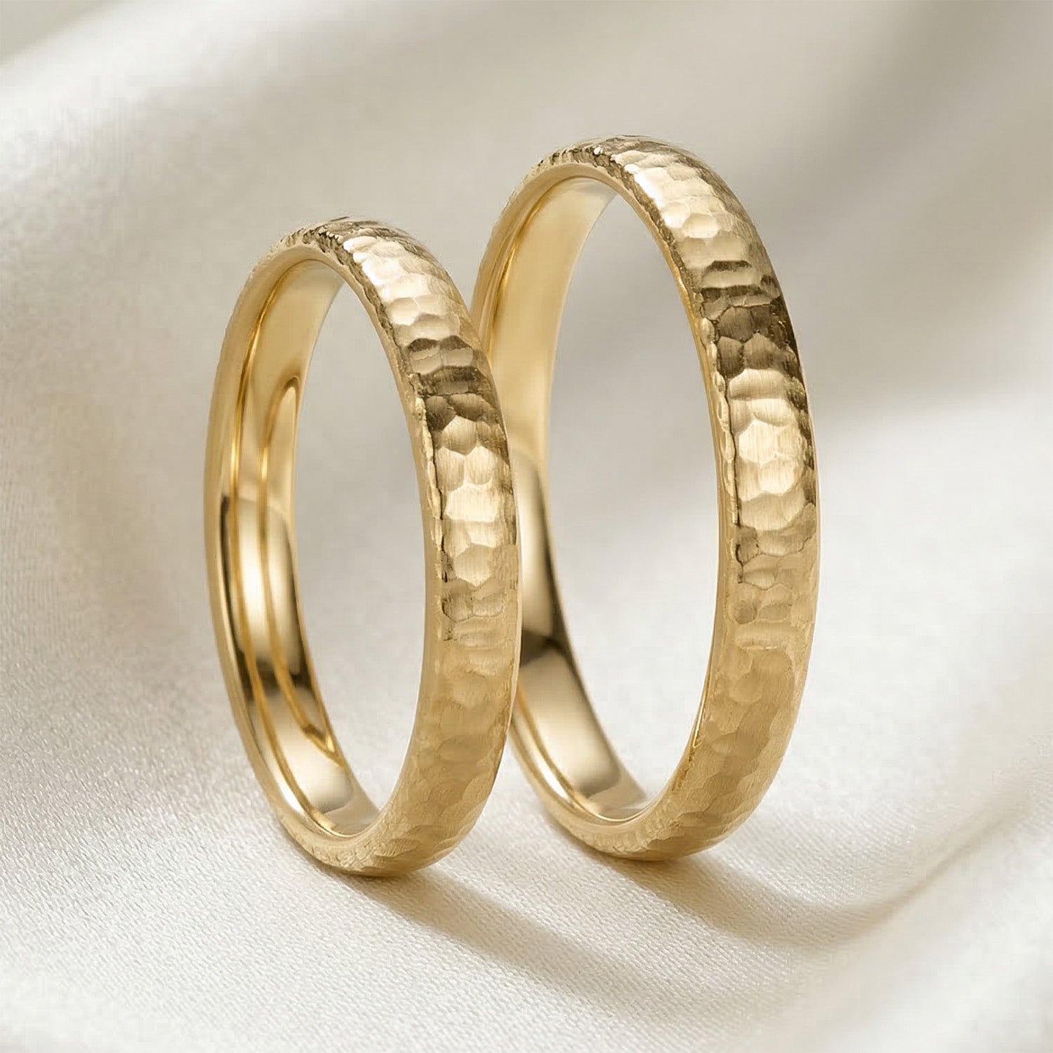 Diese Oberfläche entsteht durch gezielte Hammerschläge auf das Edelmetall und erzeugt eine lebendige, unregelmäßige Struktur. Dadurch erhält der Ring eine kraftvolle, handwerkliche Ausstrahlung mit einem bewusst individuellen Charakter. Das Licht wird unterschiedlich gebrochen, was für ein spannendes Spiel aus Glanz und Tiefe sorgt. Gehämmerte Oberflächen eignen sich besonders für Paare, die Wert auf eine natürliche, unverwechselbare Optik legen und bewusst auf Perfektion im klassischen Sinne verzichten.